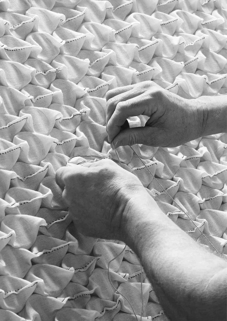 Each Vispring creation bears the hallmarks of its distinguished lineage. The borders are hand side-stitched in the traditional manner, by master craftsmen working with double-ended needles and flax twine. The cover is fashioned from ticking, an elegant fabric of unparalleled sheen and weight. The sides are ventilated by delicate roundels of gauze, maintaining the interior’s purity with a constant flow of air. The domed surface is sculpted by hand-tied tufts and embroidered with a name, like a family heirloom.
