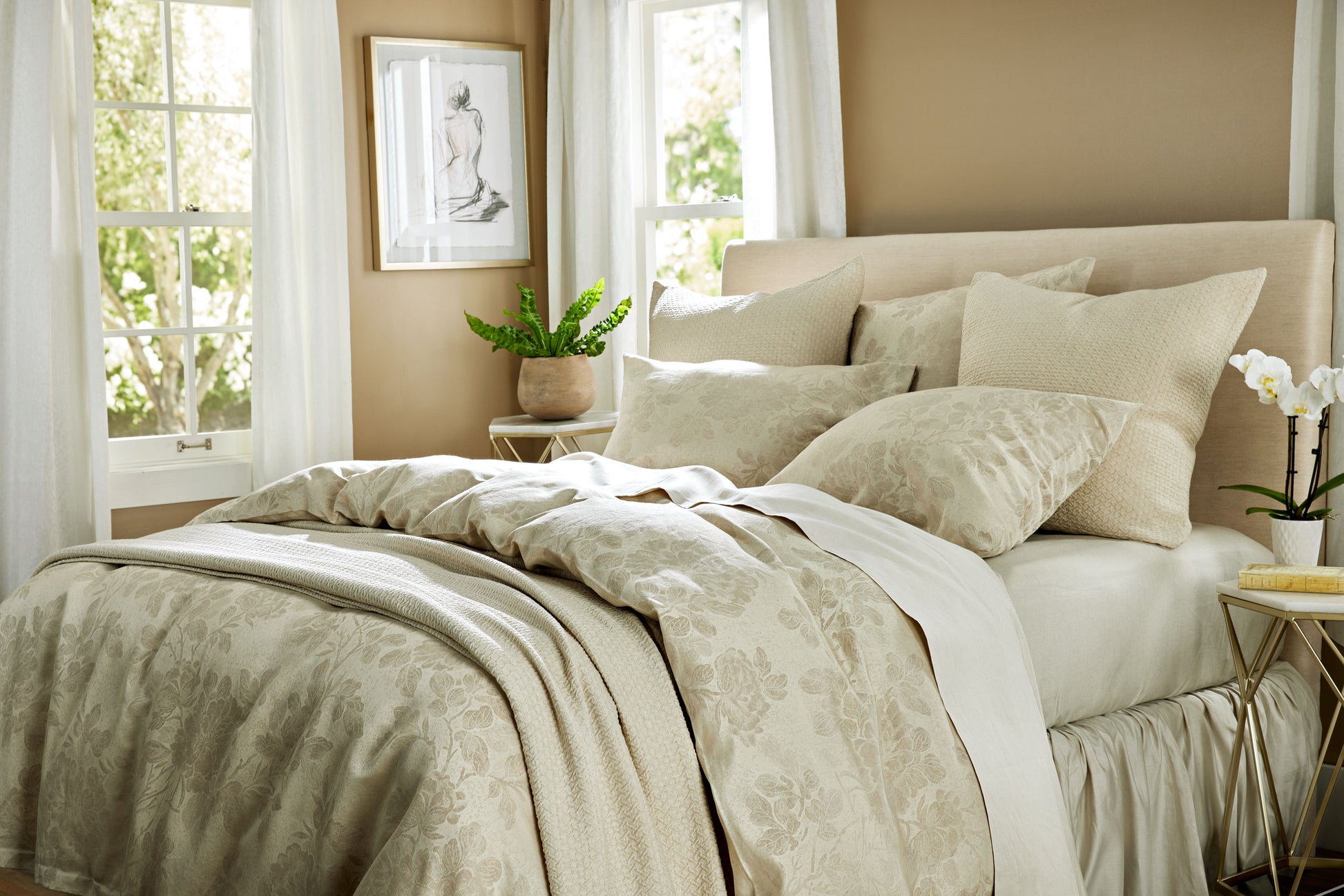 A blend of natural, undyed cotton and linen woven in a timeless floral jacquard.